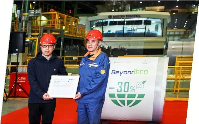 2023年4月,通過數字化碳管理係統嚴密設計、跟蹤、測算、評估,國內第一卷低碳鋼產品下線,助力寶鋼股份與北京奔馳共同打造低碳綠色汽車鋼鐵供應鏈。 (寶鋼股份 供圖)