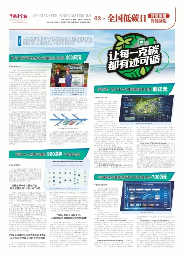自2023年以來,南鋼充分發揮自身數字化研發能力優勢,建成智慧能源一體化管控平台、產品全生命周期評價(LCA)及碳足跡計算係統以及CBAM應對及填報係統等數字化平台,同時探索構建與企業生產運行數字化係統深度融合的智慧碳管理體係,為南鋼加快綠色低碳轉型、促進全流程產業鏈協同降碳提供有力支撐。