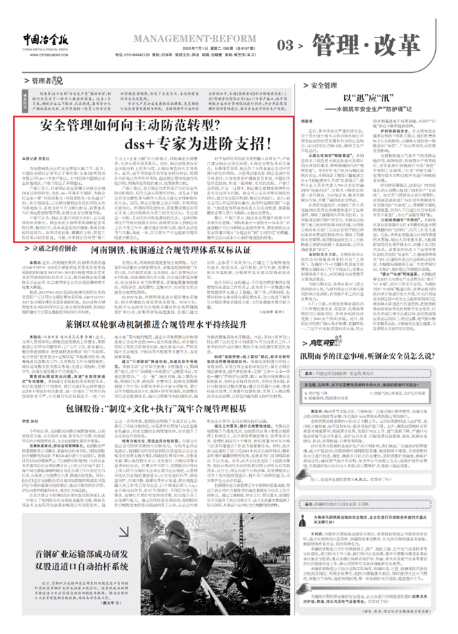 盧春江表示,目前鋼企安全管理正從被動合規向主動防範轉型,為此,dss+開展多方調研,為鋼企打造出一套“風險具象化+風險顯性化+體係融合”的三維升級路徑,以化解當前鋼企存在的風險認知與落地脫節、係統分析與行為轉化斷層、管理體係與日常運營割裂等矛盾,助推企業安全管理升級。