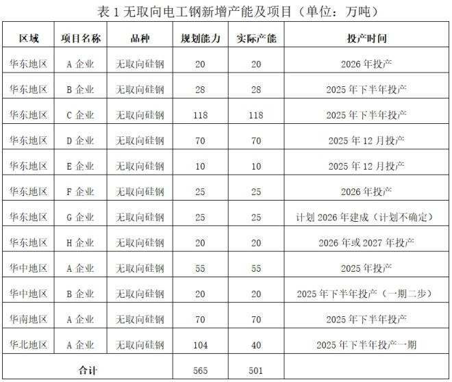 據不完全統計,2025年上半年,我國電工鋼在建及計劃投產項目為27項;其中,取向電工鋼15項,年產能共計167萬噸;無取向電工鋼12項,年產能共計501萬噸。