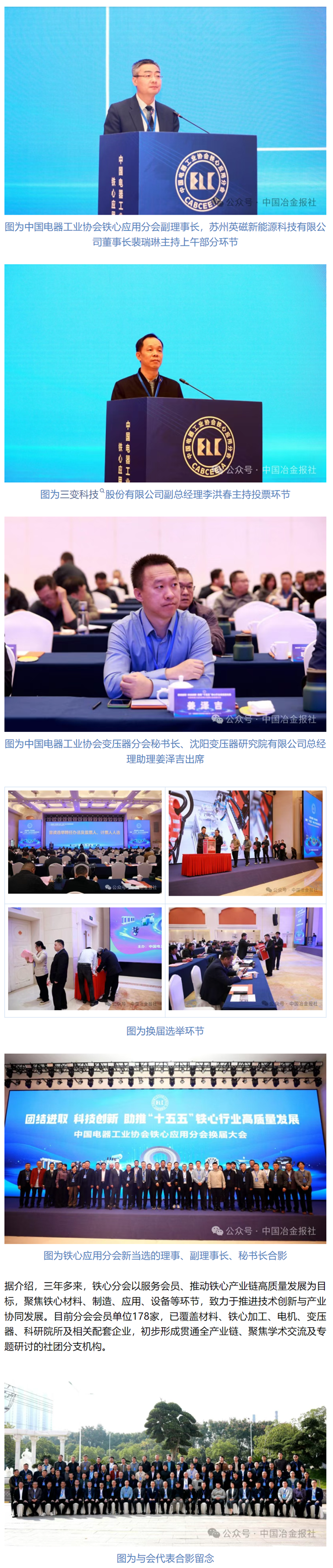 他認為,鐵心分會基本實現了產業鏈全覆蓋,從電工鋼、非晶合金等高性能軟磁材料和部分永磁材料,以及電工鋼各類輔、配套材料,到鐵心製造、變壓器及電機製造等產業鏈上下遊核心行業,並延伸至高校院所、科研機構以及配套服務企業,形成了從原材料供應、生產製造到技術研發、配套服務的全鏈條協同生態閉環。