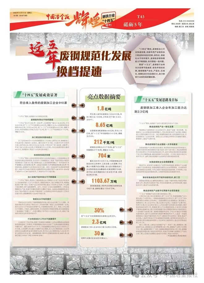 主要目標方麵,結合發展現狀,到“十五五”末,我國廢鋼鐵產業主要達成以下9項目標:一是提高廢鋼鐵綜合應用水平,到“十五五”末全國煉鋼綜合廢鋼比達到30%;二是提高規範企業廢鋼鐵加工配送能力,廢鋼鐵加工準入企業年加工能力達到2.3億噸;三是提高產業集中度,培育行業重點企業達到30家以上;四是加強行業標準化體係建設,做好現有標準的宣貫工作,積極製(修)訂行業需要的標準;五是有針對性地開展綠色低碳改造、數字化轉型和提升供應鏈韌性等相關內容的培訓;六是銜接行業標準,推廣廢鋼鐵智能檢判係統,引導企業規範應用智能化檢判技術,提升行業的標準化程度和整體檢判水平;七是進一步提高廢鋼鐵加工裝備節能環保技術水平,鼓勵采用先進的加工裝備,推動產業升級;八是研究和設計開發廢鋼鐵價格指數,指導現貨市場定價;九是加強對再生鋼鐵原料期貨上市品種和方案的研究,穩妥有序推進品種上市工作。