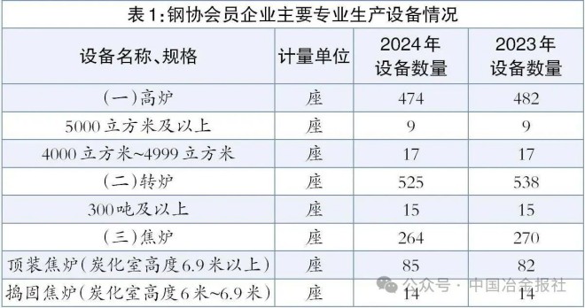 截至2024年末,我國鋼鐵企業通過產能置換計劃建設轉爐209座(含已建成裝備,下同),其中200噸及以上25座,產能占比為18.7%;電爐161座,其中100噸及以上94座,產能占比為72.1%;高爐238座,其中2000立方米及以上高爐67座,產能占比為42.0%。裝備大型化趨勢明顯,尤其是沿海地區,計劃建設的高爐中,容積大於2000立方米的高爐產能占比約為62.7%。此外,計劃建設的煉鋼產能中,轉爐、電爐、AOD爐(氬氧精煉爐)產能占比分別為69.7%、27.2%、3.1%;退出煉鋼產能中,轉爐、電爐產能占比分別為82%、18%,長流程向短流程轉型的趨勢顯現。(中國鋼鐵工業協會會員企業主要專業生產設備情況見表1)