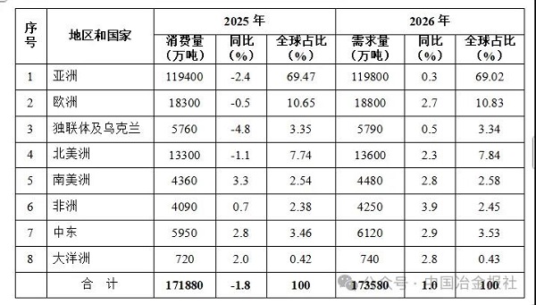 表2 2025年和2026年全球主要地區鋼材需求預測