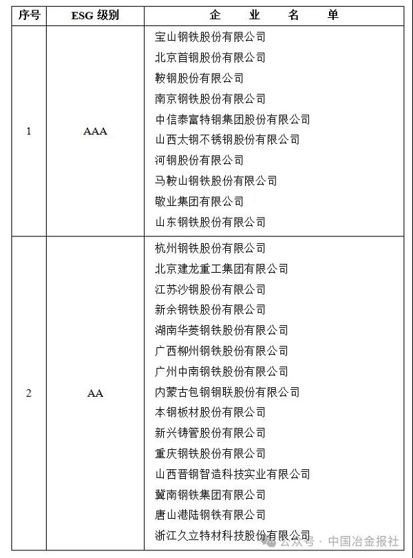 該院發布的2025國內鋼鐵企業ESG評級結果顯示,寶鋼股份、首鋼股份、鞍鋼股份、南鋼股份、中信泰富特鋼、太鋼不鏽、河鋼股份、馬鋼股份、敬業集團、山鋼股份10家鋼企獲評為AAA級,杭鋼股份、建龍集團、沙鋼股份、新餘鋼鐵、華菱股份、柳鋼股份、中南股份、包鋼股份、本鋼板材、新興鑄管、重鋼股份、晉鋼智造、暨南鋼鐵、港陸鋼鐵、久立特材15家鋼企獲評為AA級(詳見表4)。