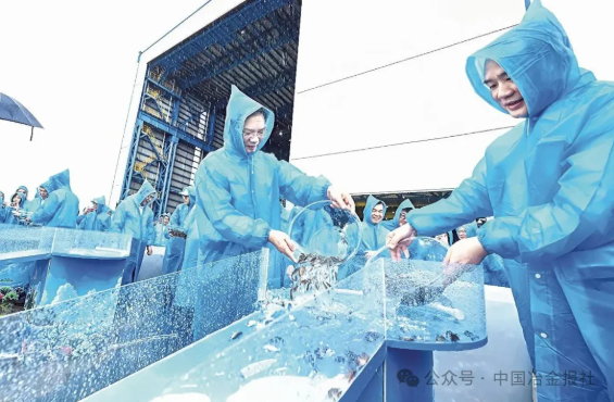 2025年8月15日,是第三個全國生態日,一場致力於改善海洋生態環境的增殖放流暨中華白海豚保護宣傳活動在中國寶武寶鋼股份湛江鋼鐵舉行(如圖)。在湛江鋼鐵全天候碼頭,隨著魚苗傾瀉而下,30萬尾黑鯛、紅笛鯛如同激起海麵波紋的雨點,一群接著一群躍動著奔入蔚藍的大海。更遠處,392萬尾斑節對蝦苗也在同時放流回歸深海。 (鍾利紅/文 施琮/攝)