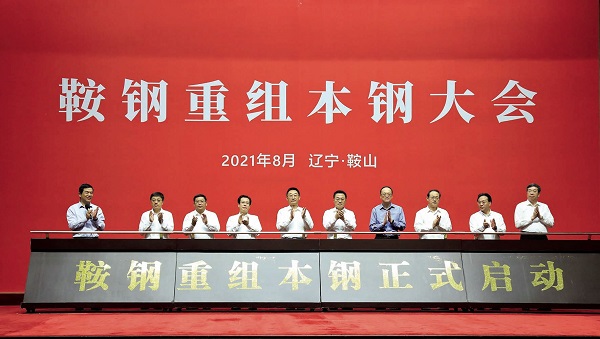 2021年8月20日,鞍鋼重組本鋼大會在遼寧省鞍山市召開。本次會議標誌著鞍鋼重組本鋼正式啟動。圖為推杆儀式現場。 (本報記者 顧學超 攝)