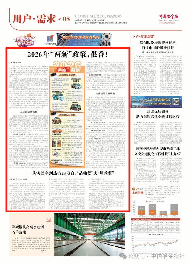 根據《通知》,2026年“兩新”政策在推進大規模設備更新方麵,支持設備更新、老舊營運貨車報廢更新、新能源城市公交車更新、老舊農機報廢更新等;在消費品以舊換新方麵,支持汽車報廢更新、汽車置換更新、家電以舊換新、數碼和智能產品購新。有業內機構測算,“兩新”政策或拉動我國鋼材消費量年均增長1200萬噸,主要拉動不鏽鋼板、無取向矽鋼、冷軋板、鍍鋅板、無縫鋼管、優特鋼棒線材等優特鋼品種的消費量。2026年,“兩新”政策的接續實施有利於繼續推動鋼材品種結構調整和優化,推動鋼材品種向高強度、輕量化、耐腐蝕、長壽命等方向轉型升級。