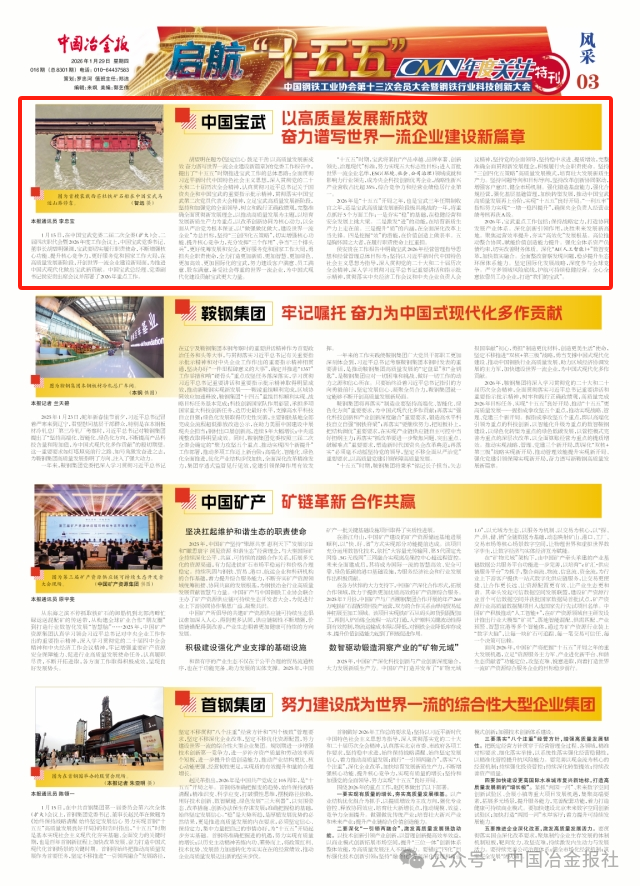 2026年,寶武重點工作包括:保持戰略定力,打造協同發展產業體係。深化創新引領作用,決勝未來發展新高地。聚焦運營效率提升,夯實“高效化”發展根基。高位推動整合協同,賦能價值創造能力提升。強化全體係資產負債約束,切實改善財務體製。深化“AI(人工智能)+”數shu智zhi變bian革ge,加jia快kuai數shu實shi融rong合he。全quan麵mian整zheng改gai督du查zha發fa現xian問wen題ti,穩wen步bu提ti升sheng生sheng態tai環huan保bao體ti係xi能neng力li。堅jian定ding國guo際ji化hua發fa展zhan戰zhan略lve,深shen度du參can與yu全quan球qiu競jing爭zheng。嚴yan守shou多duo領ling域yu風feng險xian底di線xian,護hu航hang可ke持chi續xu穩wen健jian經jing營ying。全quan心xin全quan意yi依yi靠kao員yuan工gong辦ban企qi業ye,打da造zao“我們的寶武”。(李忠寶)