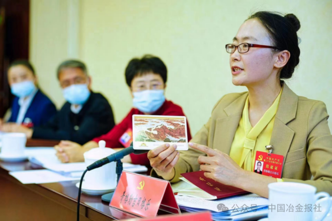 2022年10月21日,在出席黨的二十大的北京團分組會上,來自首鋼集團的青格勒吉日格樂代表展示了外形為明信片的首鋼“蟬翼鋼”。