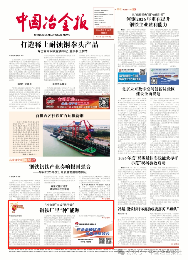 【1】 凡本網注明"來源:中國冶金報—中國鋼鐵新聞網"的所有作品,版權均屬於中國鋼鐵新聞網。媒體轉載、摘編本網所刊 作品時,需經書麵授權。轉載時需注明來源於《中國冶金報—中國鋼鐵新聞網》及作者姓名。違反上述聲明者,本網將追究其相關法律責任。
