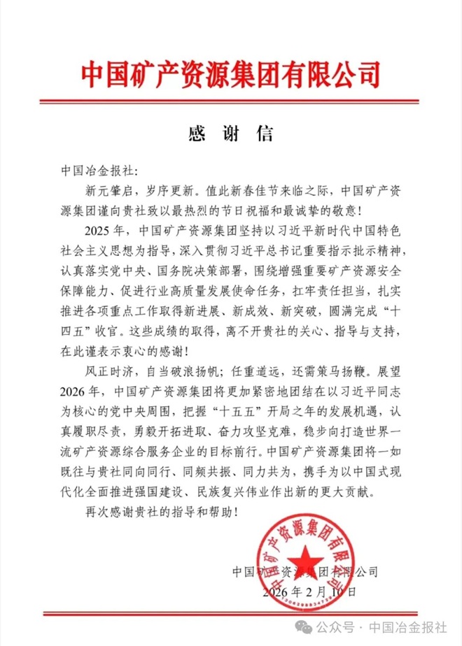 中國礦產資源集團有限公司向中國冶金報社發來感謝信