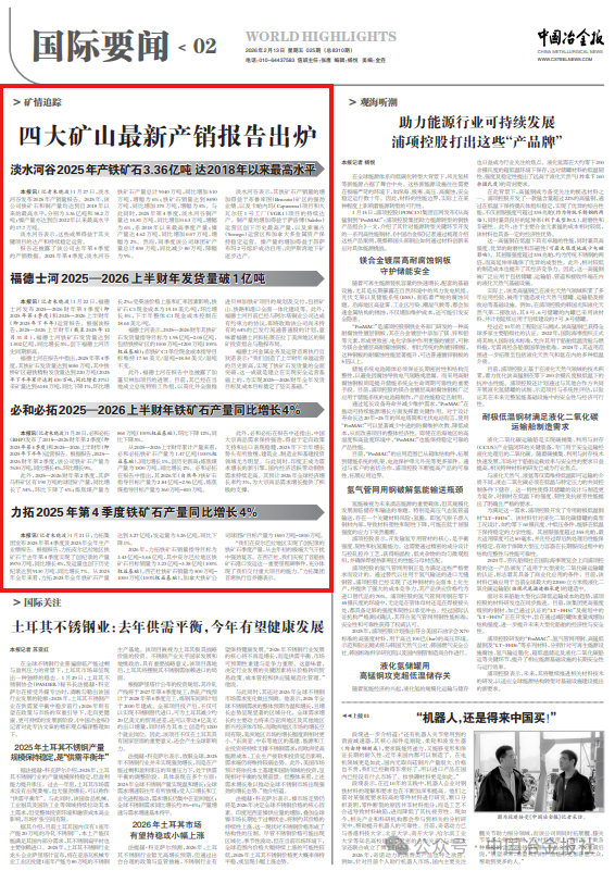 【1】 凡本網注明"來源:中國冶金報—中國鋼鐵新聞網"的所有作品,版權均屬於中國鋼鐵新聞網。媒體轉載、摘編本網所刊 作品時,需經書麵授權。轉載時需注明來源於《中國冶金報—中國鋼鐵新聞網》及作者姓名。違反上述聲明者,本網將追究其相關法律責任。