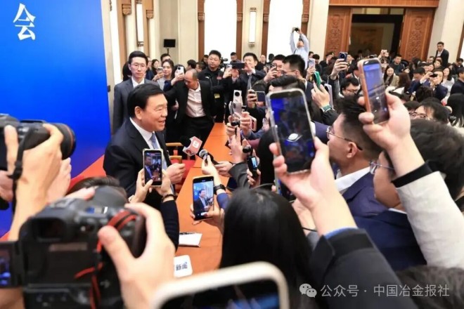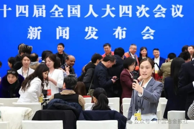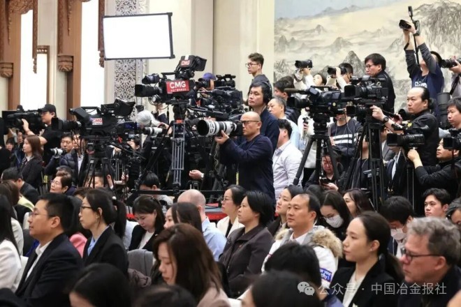 新聞發布會結束後,中國冶金報社兩會報道組記者樊三彩(右)等媒體記者們搶抓新聞,第一時間在現場拍攝小視頻報道。