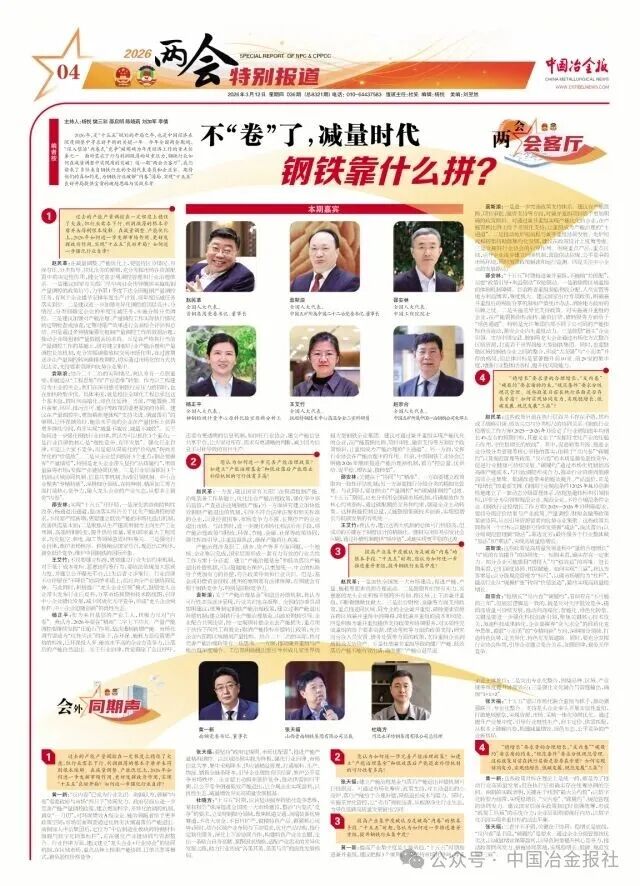2026年,是“十五五”規劃的開局之年,也是中國經濟在深度調整中尋求新平衡的關鍵一年。今年全國兩會期間,“深入整治‘內卷式’競爭”被明確為年度經濟工作的重點任務之一。麵對需求下行與利潤微薄的雙重壓力,鋼鐵行業如何在減量調整中實現質的突破?這一期“兩會雲客廳”,我們請來了多位來自鋼鐵行業的全國代表委員和企業家。期待他們的真知灼見,為鋼鐵行業破解“內卷”困局、實現“十五五”良好開局提供寶貴的破題思路與實踐參考。