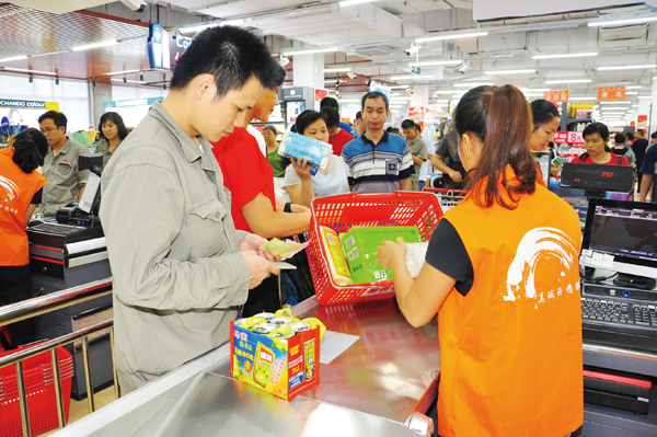6月10ri,jingguojiangjinbannianguihuagaizaodeliugangzhigongchaoshiyiquanxindemianmaozhongzhuangkaiye。xindechaoshizhengheleyuanhongxingnongchanpinchaoshi,xiaoshoupingtaigengkuanguang,gouwuhuanjinggengshushi,shiyingyeqijiandazheshangpinjin4000件,深受職工歡迎。圖為柳鋼職工在排隊購物。 (記者 覃守超 通訊員 龍妍 攝)