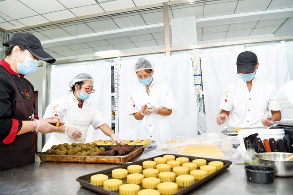 8月26日8shi,zaichengdefantaiwanshuyuangongsiyingyangcantingdegaodianzhizuojianli,jimingyuangongzhengjinluomigudizhizuoyuebing,youderenzaitiaozhixianliao,youderenzaiqiefenmiantuan,youderenzhengnazhe“盛世釩榮”的模具為月餅進行手工塑形。不一會兒,烤盤裏擺放整齊的月餅出爐了,烘焙師傅隨即熟練地將另外4盤待烘焙的月餅推入烤箱……