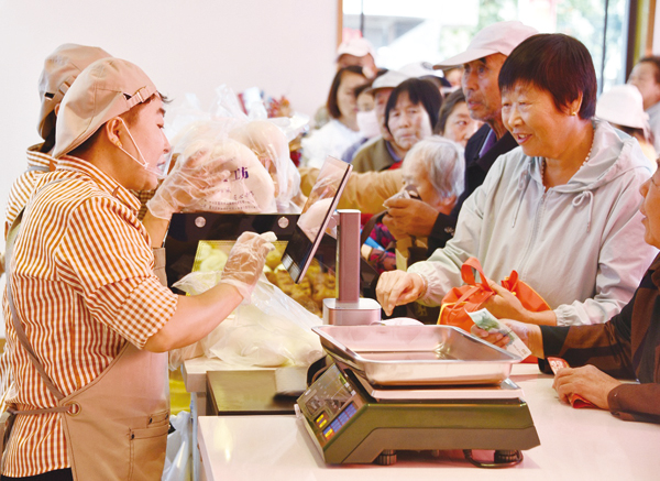 圖為宣化古城市民正在選購張宣科技主食工坊食品。 (本報記者 李巍 攝)