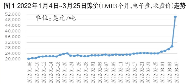 2022年以來,受新能源、局部地緣衝突等因素的刺激,鎳價不斷上攻,截至2022年3月7日,鎳價(LME3個月,電子盤,收盤價)達到50300美元/噸,創曆史新高,較2022年1月4日的21040美元/噸上漲了139%。(見圖1)
