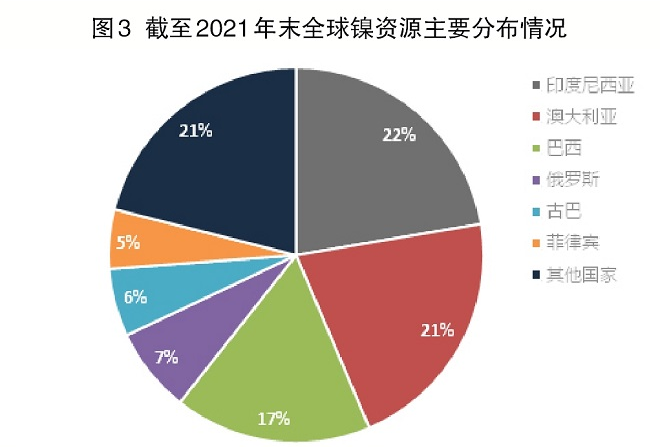 根據美國地質調查局2021年的數據顯示,全球已探明鎳資源(鎳含量高於0.5%)約3億噸,其中紅土鎳礦占比約60%,硫化鎳礦占比約40%。截至2021年末,全球鎳可采儲量約9400萬噸,其中,印度尼西亞可采儲量為2100萬噸,澳大利亞為2000萬噸,巴西為1600萬噸,俄羅斯為690萬噸,古巴為550萬噸,菲律賓為480萬噸。上述六國可采儲量合計占全球總量的近80%。(見圖3)