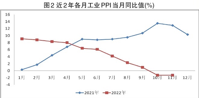 工業PPI當月同比值基本走勢。2022年前9個工業PPI當月同比值正增長,但2月—9月份各月同比增幅呈現逐月回落態勢(見圖2)。如2022年1月份工業PPI當月同比值為9.1%,9月份工業PPI當月同比值已回落至0.95%,即曆經8個月的時間,工業PPI當月同比值回落了8.15個百分點;2022年10月份、11月份工業PPI當月同比值均為-1.3%,為2021年1月以來首次連續2個月下降。但2022年10月份、11月份工業PPI同比下降,主要源於同比期(2021年10月份、11月份)PPI基數過高,2021年10月份、11月份工業PPI同比(較2020年10月份)分別大幅上漲13.5%、12.9%,在1996年以來工業PPI當月同比漲幅排序中居前2位。