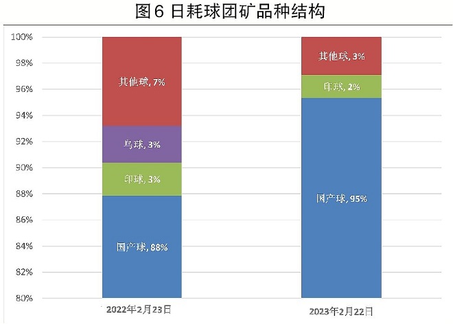 全國日耗球團礦品種結構。圖6所示為全國2022年2月下旬和2023年2月下旬全國樣本鋼廠日耗球團礦的品種結構。可以發現,日耗球團礦的結構變化相對較大。其中,國產球團礦占比大幅提升,由88%提高至95%。原因主要是2022年nian球qiu團tuan廠chang受shou環huan保bao限xian產chan的de影ying響xiang,供gong應ying受shou限xian,而er今jin年nian此ci影ying響xiang明ming顯xian減jian弱ruo,供gong應ying量liang明ming顯xian回hui升sheng,故gu絕jue大da多duo數shu球qiu團tuan礦kuang實shi現xian了le國guo產chan化hua。同tong時shi,因yin俄e烏wu衝chong突tu的de影ying響xiang,烏wu克ke蘭lan球qiu團tuan礦kuang無wu法fa正zheng常chang生sheng產chan,今jin年nian已yi無wu進jin口kou,故gu其qi日ri耗hao占zhan比bi由you3%降為了0。