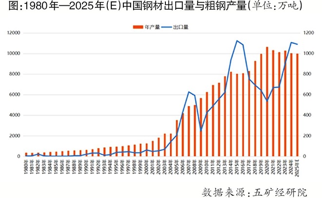 20世紀80年代末,中國鋼鐵企業開始在秘魯、澳大利亞以參股、並購等形式建設鐵礦石生產基地。1987年,中鋼和澳大利亞力拓公司簽署協議合營恰那鐵礦。1992年,首鋼斥資1.2億美元收購了秘魯鐵礦公司。21世紀後,隨著我國粗鋼產量的節節攀升,我國鋼鐵產品的出口量逐年增加,2005年,我國鋼材出口量達到2066萬噸,一舉使我國首次成為鋼材淨出口國。也正是從這一年起,中國粗鋼產量正式開啟了“一騎絕塵”的增長模式。中國粗鋼產量的快速增長也使得我國國內鐵礦石供應難以滿足生產所需,2025年我國鐵礦石對外依存度首次接近50%,之後逐年上升至目前83%左右的超高水平。2005年後,眾多中國鋼鐵企業紛紛“走出去”謀求海外資源的供給。從以上情況分析,筆者認為2005年是中國鋼鐵行業的“出海”元年,這一年中國原料購買與成材銷售同時奔赴海外市場。2008年,中國鋼材出口量首次突破5000萬噸,占全國粗鋼產量比例接近12%。鋼材出口換彙成為各鋼鐵生產企業紛紛效仿和追逐的目標。
