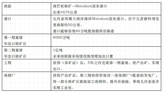 據商務部駐幾內亞使館經商處消息 綜合幾內亞多家媒體的報道,贏聯盟中標幾內亞西芒杜鐵礦1號和2號礦區區塊。贏聯盟在投標書中提出的基建計劃總體如下:
