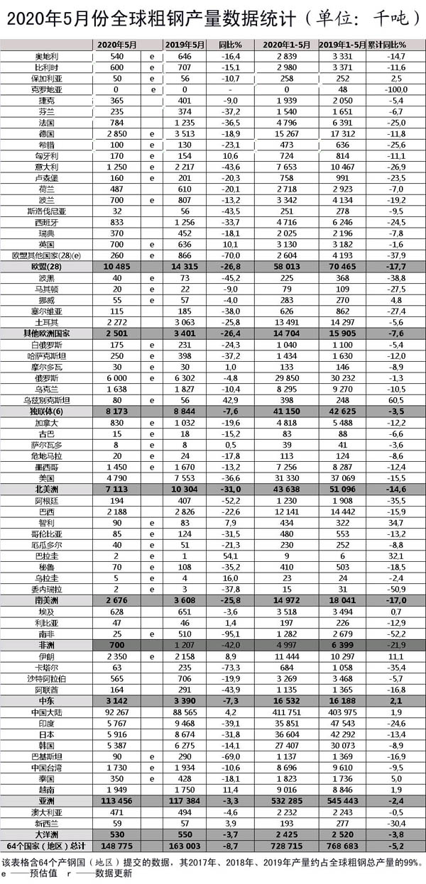 5月份,亞洲粗鋼產量為1.13億噸,同比下降3.3%;歐盟粗鋼產量為1048萬噸,同比下降26.8%;北美洲粗鋼產量為711萬噸,同比下降31.0%;南美洲粗鋼產量為268萬噸,同比下降25.8%;中東地區粗鋼產量為314萬噸,同比下降7.3%;獨聯體的粗鋼產量為817萬噸,同比下降7.6%。