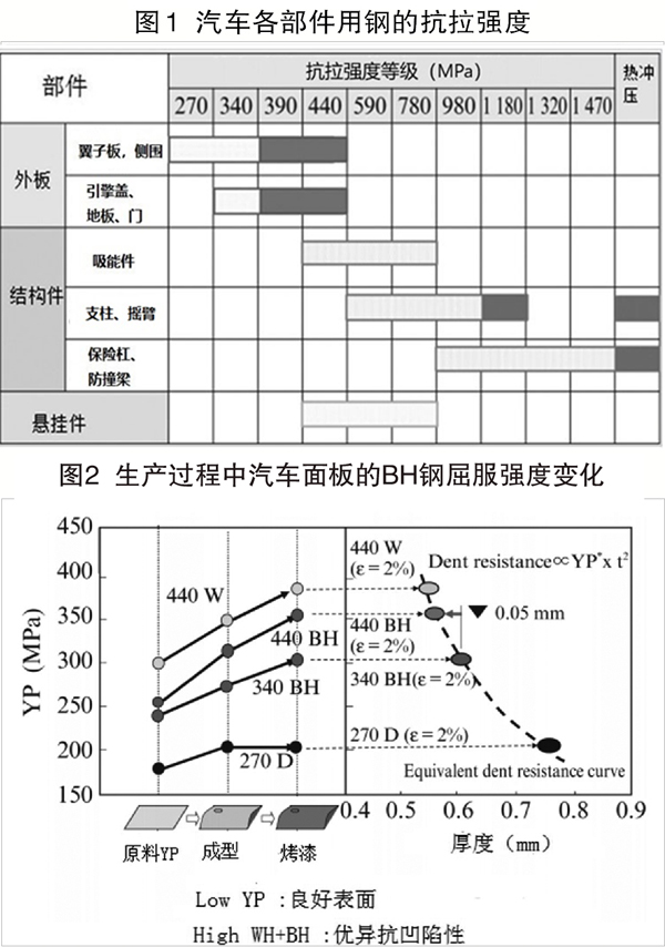 圖2顯示了用於汽車麵板的BH(烘烤硬化)gangzaishengchanguochengzhongqufuqiangdudebianhua。zhexiegangbanyinchongyachengxingerbiaoxianchujiagongyinghua,tongshiyouyutuliaohongkaodereliangershixiaoyinghua。zaiyazhichengxingzhong,ketongguojiangdiqufuqiangduhuodeyouyidebiaomianzhiliang。yuchanggui340BH和普通440W鋼板相比,440BH的屈服強度低於440W,與340BH大致相同;經烘烤處理後的440BH屈服強度高於340BH,接近440W。考慮到抗凹陷性與厚度的1/2次方成正比,使用440BH鋼代替340BH鋼,可使厚度減小0.05毫米。440BH鋼的低屈服強度歸因於鐵素體基體中的馬氏體含量少。