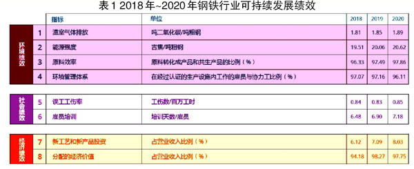 世界鋼協通過收集會員企業相關數據,係統地衡量了鋼鐵行業的經濟、環境和社會可持續發展績效(如表1)。據了解,此次共有94家鋼鐵企業和協會向世界鋼協提供了2018年~2020年相關數據(參與統計的企業粗鋼總產量略高於10億噸,占全球粗鋼總產量的53.7%)。