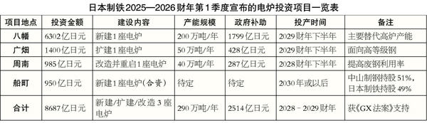日本製鐵宣布到2029年將投資8687億日元(58.68億美元),在日本八幡、廣畑、周南等地新建或改造電爐,使電爐產能占比從28%提升至33%,以實現2030年減碳30%的目標。這一計劃已獲日本政府《GX法案》(綠色轉型法案)支持,預計將獲得最高2514億日元(16.98億美元)的補貼。
