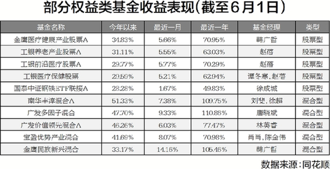 從行業來看,醫藥主題基金占據股票型基金收益榜前列。同花順數據顯示,韓廣哲管理的金鷹醫療健康產業股票A今年以來的收益率為34.83%,位居股票型基金業績榜首;趙蓓管理的工銀養老產業股票A和工銀前沿醫療股票A收益率緊隨其後,分別為31.11%和29.77%。此外,部分鋼鐵指數基金業績排名同樣居前。實際上,今年以來,已有35隻股票型基金、96隻混合型基金收益率超過20%。