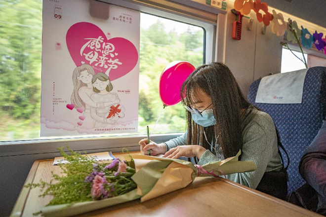 在萬州北開往重慶北的C6407次列車上,旅客為母親寫祝福卡片。記者 黃偉 攝