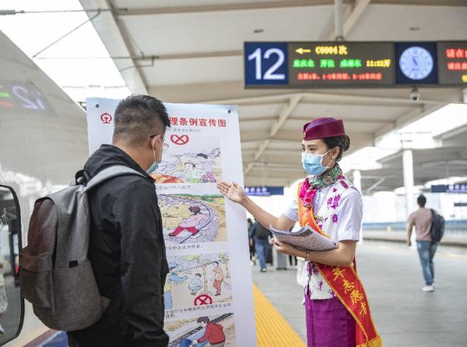 中國鐵路成都局重慶客運段的誌願者向旅客宣講鐵路安全知識。記者 黃偉 攝