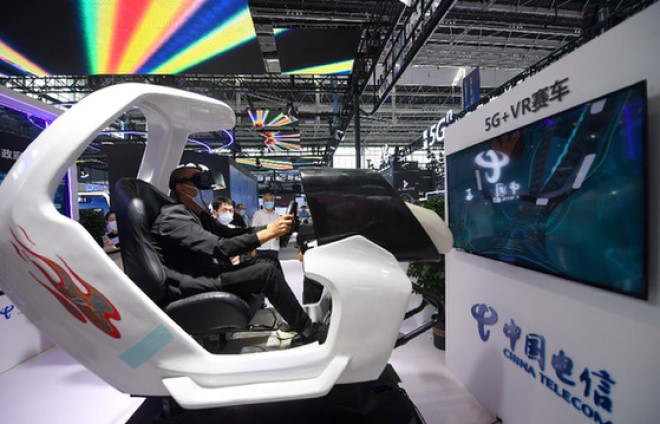9月6日,參觀者在體驗5G+VR賽車。 當日,2021中國國際數字經濟博覽會在河北省石家莊市開幕。本屆博覽會以“創新發展與數字經濟”為主題,設主題展館、數字產業館、數字生活館等5個展示區域,聚焦數字經濟領域新業態、新模式和前沿熱點。 新華社記者 王曉 攝