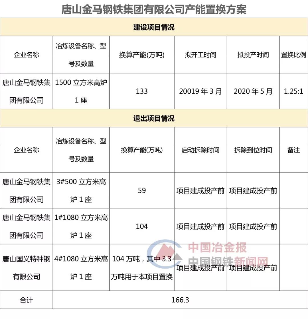 根據河北省工信廳2018年11月27日發布的唐山金馬鋼鐵集團有限公司建設項目產能置換方案公告,唐山金馬鋼鐵擬於2019年3月份在原廠區(河北省唐山市灤縣茨榆坨工業區)實施減量置換,新建一座1500立方米高爐,同時淘汰原有500立方米、1080立方米高爐。具體置換方案如下——