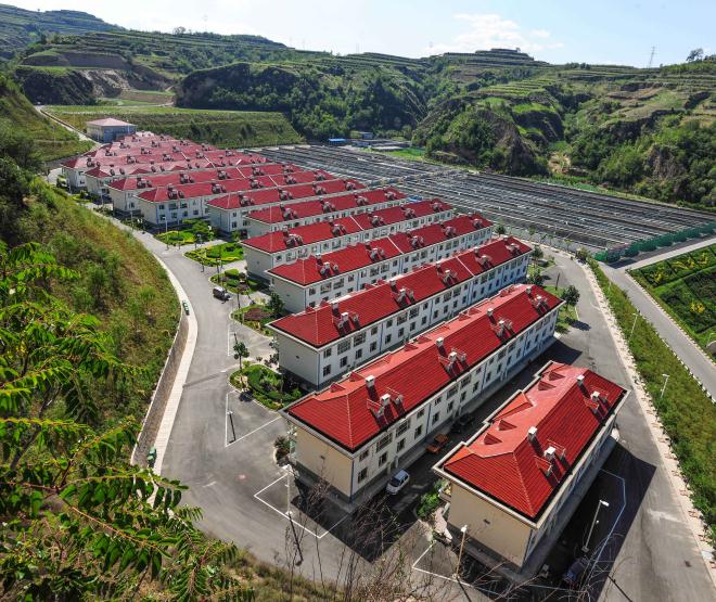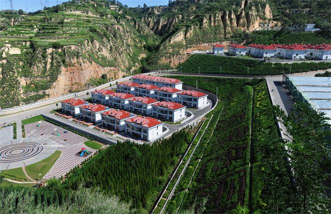 群山環抱中的村子,小別墅高層住宅錯落有致,筆直柏油路、齊刷刷路燈、觀景式蓄水池、蔬菜大棚、噴泉小廣場……這是中陽縣陽坡塔村。