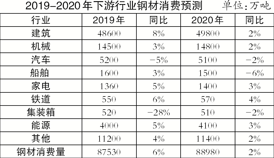 2020年鋼鐵主要下遊行業表現預計會繼續分化。其中,基礎設施建設投資將加碼,房地產行業投資、新開工麵積增速可能放緩,家電行業保持平穩增長,汽車、船舶、集裝箱和機械行業的部分子行業可能出現負增長。但總體而言,鋼材需求量預計整體小幅增長,達到8.9億噸,同比增長2%。