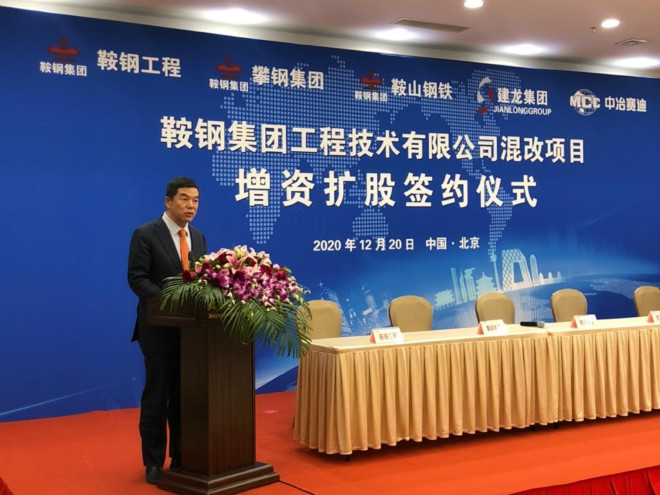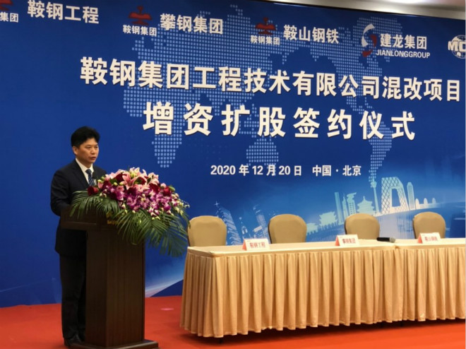 鞍鋼集團總經理、黨委副書記戴誌浩,北京建龍重工集團董事長、總裁張誌祥,中冶科工集團黨委副書記、中國中冶總裁張孟星,上海聯合產權交易所黨委書記、總裁周小全出席簽約儀式並發表致辭。鞍鋼工程發展公司黨委書記、董事長於峰主持簽約儀式。