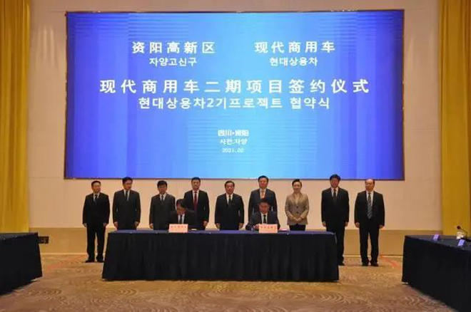 2月24日,現代商用汽車(中國)有限公司與資陽高新區簽約,投資22.3億元用於現代商用車二期項目建設,重點強化包括氫燃料電池汽車在內的新能源汽車產品研發和生產。