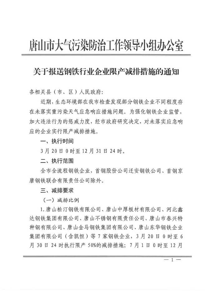 近日,唐山市發布《關於報送鋼鐵行業企業限產減排措施的通知》(以下簡稱“《通知》”),對未落實應急響應的企業實行限產減排措施。