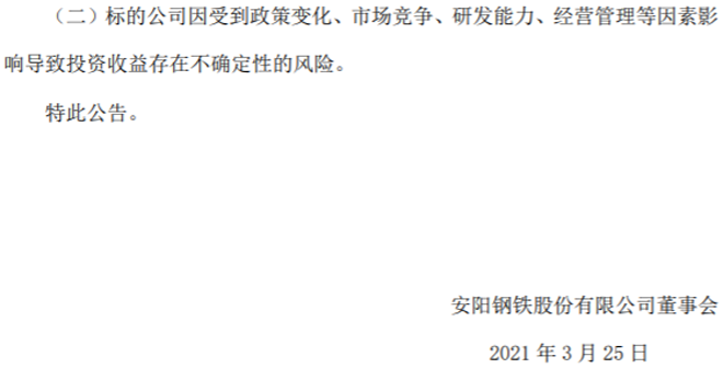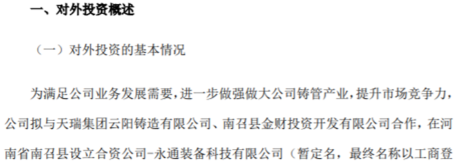 3月26日,安陽鋼鐵發布公告稱,該公司擬與天瑞集團雲陽鑄造有限公司、南召縣金財投資開發有限公司合作,在河南省南召縣設立合資公司——永通裝備科技有限公司。合資公司注冊資本3億元。安陽鋼鐵貨幣出資1.37億元,持股比例45.53%。公告表示,此次對外投資,將進一步做強做大安陽鋼鐵鑄管產業。