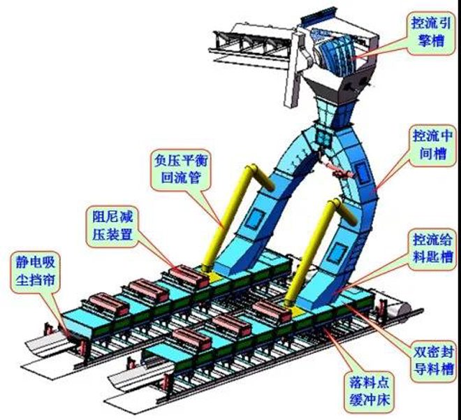 大(da)幅(fu)度(du)減(jian)少(shao)物(wu)料(liao)輸(shu)送(song)破(po)碎(sui),提(ti)高(gao)成(cheng)品(pin)率(lv),更(geng)好(hao)的(de)降(jiang)低(di)汙(wu)染(ran)物(wu)外(wai)排(pai),改(gai)善(shan)生(sheng)產(chan)環(huan)境(jing)空(kong)氣(qi)質(zhi)量(liang)。相(xiang)對(dui)傳(chuan)統(tong)普(pu)通(tong)導(dao)料(liao)槽(cao)單(dan)點(dian)受(shou)料(liao)技(ji)術(shu)除(chu)塵(chen)風(feng)量(liang)可(ke)降(jiang)低(di)~25%,多點受料的導料槽除塵點數量可減少約1/3,每點風量可降低~20%,由此,整個除塵係統風量配置至少可減少30%,除塵電機裝容量可減少40%~50%。與傳統工藝裝備相比,在投資和運行成本方麵也具有很大的競爭優勢。隨著環保態勢日益嚴苛、超低排放和崗位粉塵濃度指標的要求提高,該技術和產品具有非常大的經濟效益和社會效益。