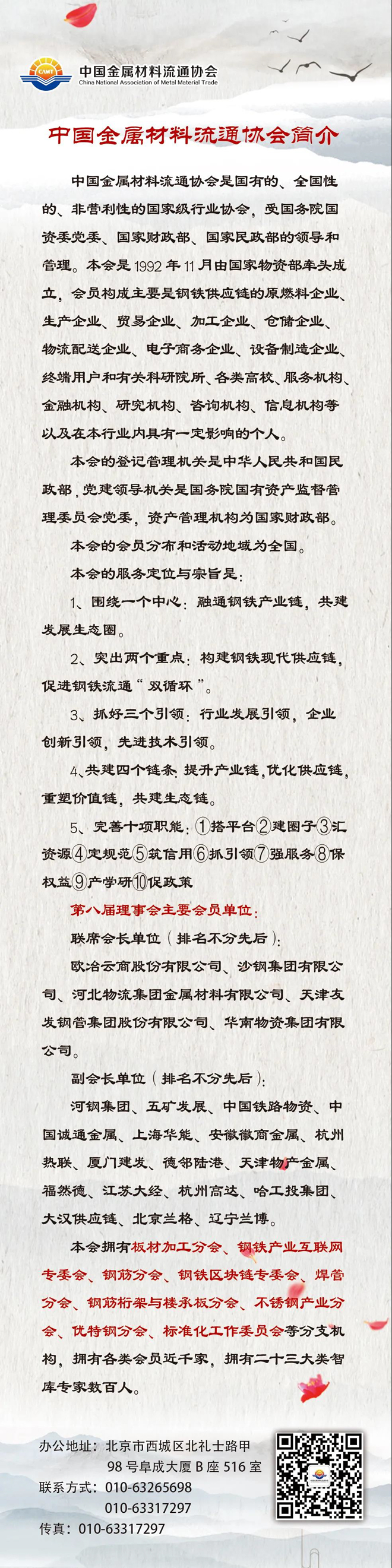 中國金屬材料流通協會成立於1992年nian,由you國guo家jia物wu資zi部bu組zu織zhi成cheng立li,在zai近jin三san十shi年nian的de流liu金jin歲sui月yue裏li,見jian證zheng了le國guo家jia金jin屬shu流liu通tong體ti係xi的de風feng雨yu曆li程cheng。近jin年nian來lai協xie會hui與yu時shi俱ju進jin,調tiao整zheng發fa展zhan思si路lu與yu模mo式shi,緊jin緊jin圍wei繞rao“融通鋼鐵產業鏈,共建發展生態圈”這個中心,積極推動行業發展引領、企業創新引領、先進技術引領,提升產業鏈,優化供應鏈,重塑價值鏈,共建生態鏈,在行業發展上發揮了重要作用。