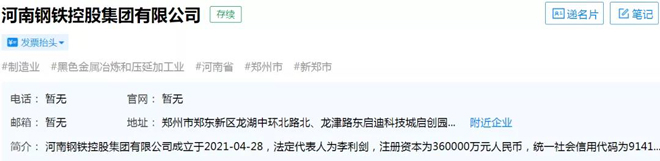 據“企查查”信息顯示,河南鋼鐵控股集團有限公司於2021年4月28日正式成立,注冊資本36億元人民幣,法定代表人為李利劍。企業注冊地址:鄭州市鄭東新區龍湖中環北路北、龍津路東啟迪科技城啟創園7號樓。該企業由安陽鋼鐵集團有限責任公司100%控股。