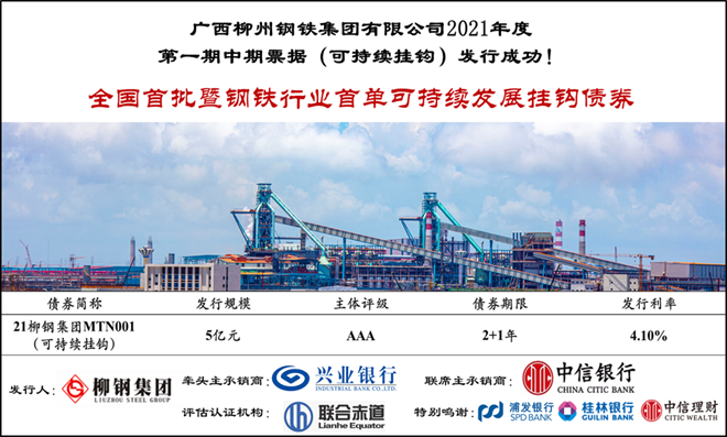 5月7日(ri),柳(liu)鋼(gang)集(ji)團(tuan)抓(zhua)住(zhu)中(zhong)國(guo)銀(yin)行(xing)間(jian)交(jiao)易(yi)商(shang)協(xie)會(hui)創(chuang)新(xin)推(tui)出(chu)可(ke)持(chi)續(xu)發(fa)展(zhan)掛(gua)鉤(gou)債(zhai)券(quan)的(de)機(ji)遇(yu),由(you)興(xing)業(ye)銀(yin)行(xing)擔(dan)任(ren)牽(qian)頭(tou)主(zhu)承(cheng)銷(xiao)商(shang),中(zhong)信(xin)銀(yin)行(xing)擔(dan)任(ren)聯(lian)席(xi)主(zhu)承(cheng)銷(xiao)商(shang),成(cheng)功(gong)發(fa)行(xing)本(ben)期(qi)票(piao)據(ju)。