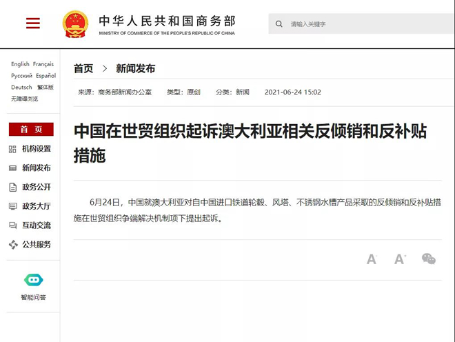 6月24日,中國就澳大利亞對自中國進口鐵道輪轂、風塔、不鏽鋼水槽產品采取的反傾銷和反補貼措施在世貿組織爭端解決機製項下提出起訴。