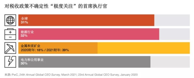 普華永道認為,稅收政策不穩仍是采礦和金屬企業麵臨的主要挑戰,39%的(de)礦(kuang)業(ye)公(gong)司(si)首(shou)席(xi)執(zhi)行(xing)官(guan)非(fei)常(chang)擔(dan)心(xin)稅(shui)收(shou)政(zheng)策(ce)的(de)不(bu)確(que)定(ding)性(xing),這(zhe)一(yi)比(bi)例(li)是(shi)去(qu)年(nian)的(de)兩(liang)倍(bei),這(zhe)些(xie)首(shou)席(xi)執(zhi)行(xing)官(guan)比(bi)其(qi)全(quan)球(qiu)同(tong)行(xing)更(geng)加(jia)關(guan)心(xin)稅(shui)收(shou)政(zheng)策(ce)的(de)變(bian)化(hua)。