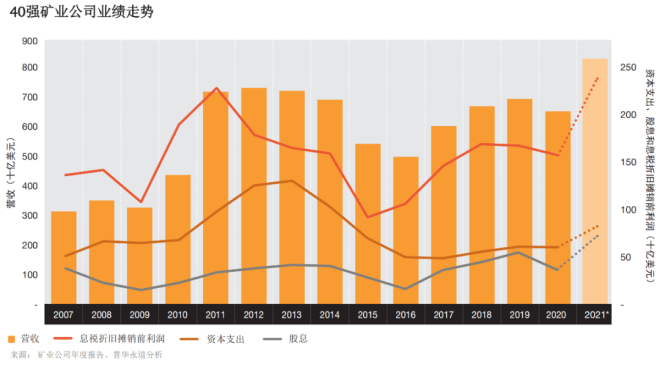 報告預計,對於全球最大的礦業公司來說,情況將會變得更好。普華永道對2021年的預測表明,前40大礦業公司的收入和EBITDA(息稅折舊攤銷前利潤)水平都將達到過去18年的最高紀錄,而淨利潤也將達到第二高紀錄。